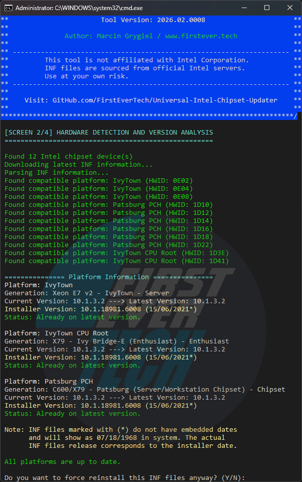 Thanks to community mirrors and shared archives, I was able to obtain older Intel Chipset Device Software installers, analyze their INF contents, and build the INF scanner and database that power this updater.