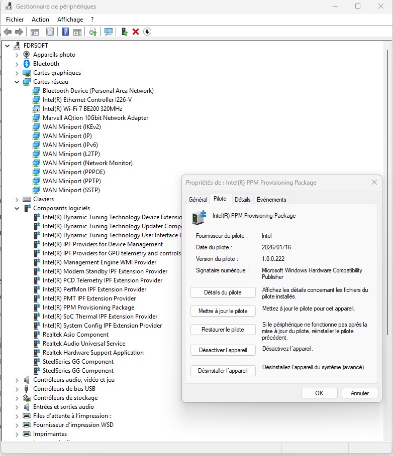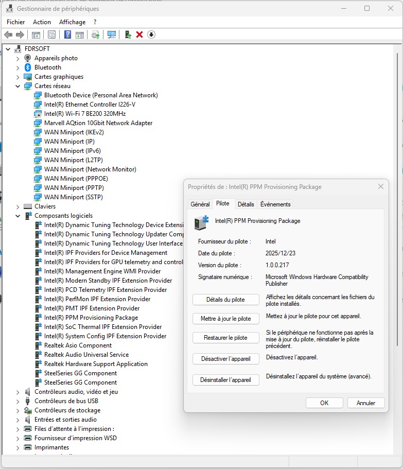 Asus Z890 ProArt, Intel Cpu Core Ultra 7 265K, Memoires 32Go Corsair DDR5 (6000Mhz CL30), Water-cooling Thermaright, nVidia Geforce RTX4060, Alimentation Gigabyte 850W, Samsung SSD 990 Pro, SSD9100 Pro, Steelserie Pro , Souris Razer, Boitier HUMMER, HP Steelserie, Free Fibre Ultra (8Go/8Go), Lan 10Gb, Cable CAT8/7, Switch 10/5/2.5Gbps, Casque Philips Fedelis.