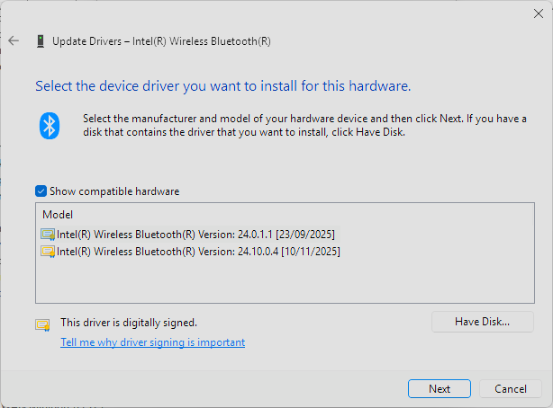 Official release by Intel® of v24.0.1.1 of the Intel® Wireless Bluetooth Driver on December 9, 2025