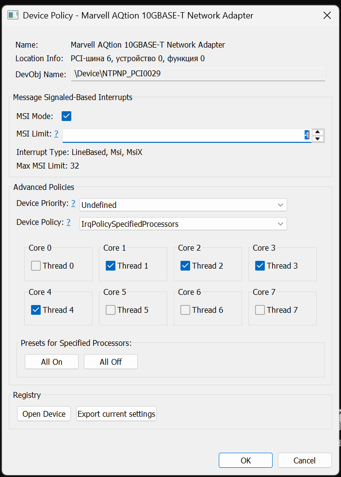 Hello! I need some advice. I set the card (PCI\VEN_1D6A&DEV_14C0&SUBSYS_E0001458; AQC113C) to Message Signaled-Based Interrupts. Everything works fine if the number of vectors is set to either 1 (traffic will be processed by only one CPU core) or any value from 17 to 32. However, values of 17-32 mean overhead, as my CPU only has 8 cores, and 17 or more vectors are excessive (E cores don't count, they're disabled).