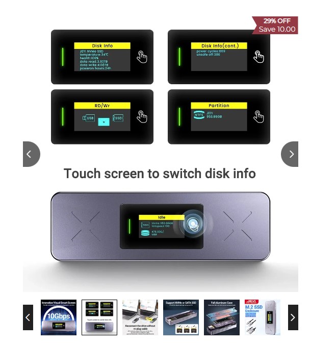 I have a JEYI model I9X, it´s have a screen that shows informations about the ssd, and a finger touch to change the screen.